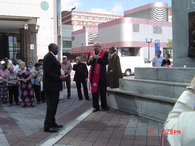 Krótka Inwokacja Ks. Stasika po poświęceniu tablicy. Słucha mer Miasta Jersey City p. L Harvey Smith.
