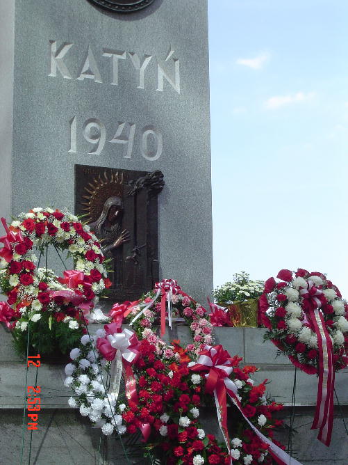Pomnik Katyński z wmurowanym obrazem - w chwilę po złożeniu wieńców.