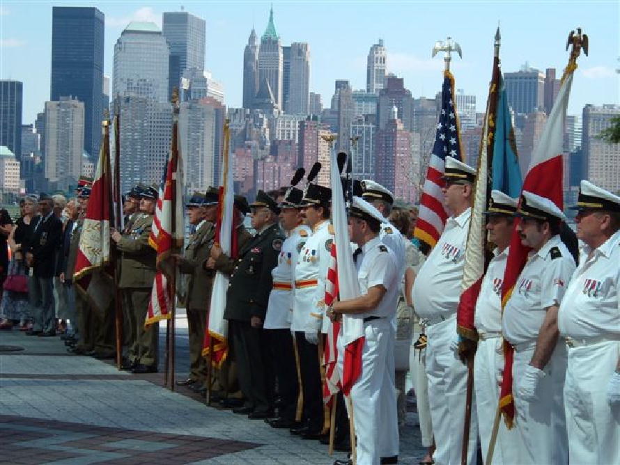 Delegacje organizacji społecznych z New Jersey, w przygotowaniu do składania wieńców pod Pomnikiem Katyńskim..